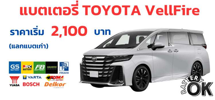 ราคาแบตเตอรี่ Toyota VELLFIRE เริ่มต้น เพียง 2,100 บาท ติดตั้งถึงที่