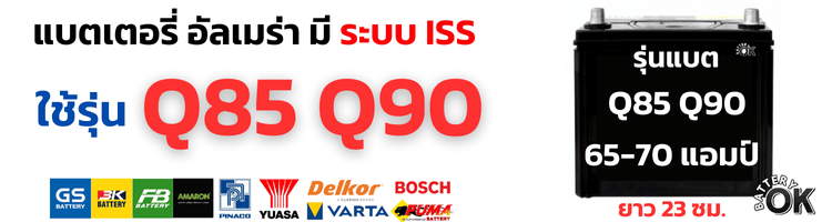 - แบตเตอรี่ อัลเมร่า มีระบบ ISS ใช้แบต 65-70 แอมป์ ขนาดแบตยาว 23 เซนติเมตรสามารถใส่แบตรหัสรุ่น Q85 Q90 ซึ่งออกแบบมารองรับ ระบบ ISS Start Stop โดยเฉพาะ ใส่ได้เลย ไม่ต้องดัดแปลง