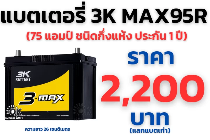 แบตเตอรี่ 3K MAX95R ขนาด 75 แอมป์ ราคา 2,200 บาท ชนิดกึ่งแห้ง ขั้วบวกอยู่ฝั่งขวา รับประกัน 12 เดือน คุณภาพดี ทน ประหยัด ร้านแบตเตอรี่โอเค ติดตั้งฟรีถึงที่ ในเขตพื้นที่บริการ