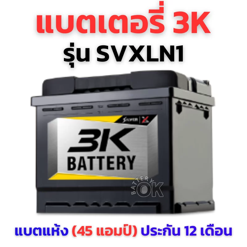 แบตเตอรี่ 3K SVXLN1 ขนาด 45 แอมป์ ราคา 2,500 บาท ชนิดแห้ง ขั้วจม ขั้วบวกอยู่ฝั่งซ้าย รับประกัน 12 เดือน คุณภาพดี ทน ประหยัด ร้านแบตเตอรี่โอเค ติดตั้งฟรีถึงที่ ในเขตพื้นที่บริการ