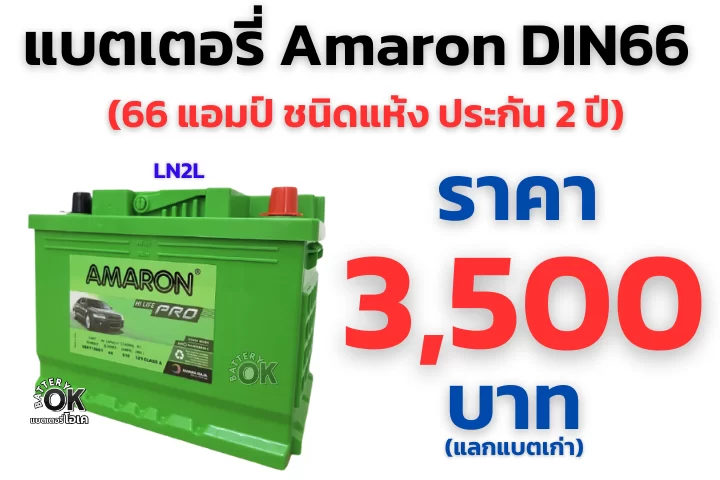 แบตเตอรี่ Amaron DIN66 ขนาด 66 แอมป์ ราคา 3,500 บาท ชนิดแห้ง ขั้วจม ขั้วบวกอยู่ฝั่งซ้าย รับประกัน 24 เดือน คุณภาพดี ทน ประหยัด ร้านแบตเตอรี่โอเค ติดตั้งฟรีถึงที่ ในเขตพื้นที่บริการ