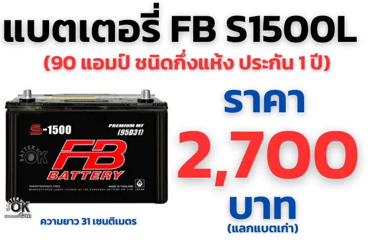 แบตเตอรี่ FB S1500L ขนาด 90 แอมป์ ราคา 2,700 บาท ชนิดกึ่งแห้ง ขั้วบวกอยู่ฝั่งซ้าย รับประกัน 12 เดือน คุณภาพดี ทน ประหยัด ร้านแบตเตอรี่โอเค ติดตั้งฟรีถึงที่ ในเขตพื้นที่บริการ