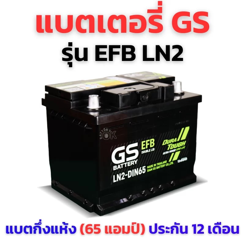 แบตเตอรี่ GS EFB LN2 ขนาด 65 แอมป์ ราคา 3,100 บาท ชนิดกึ่งแห้งรองรับ Start Stop ขั้วจม ขั้วบวกอยู่ฝั่งซ้าย รับประกัน 12 เดือน คุณภาพดี ทน ประหยัด ร้านแบตเตอรี่โอเค ติดตั้งฟรีถึงที่ ในเขตพื้นที่บริการ