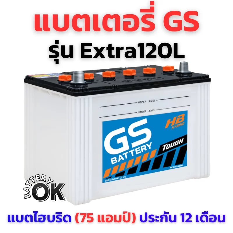 แบตเตอรี่ GS EXTRA120L ขนาด 75 แอมป์ ราคา 2,500 บาท ชนิดไฮบริด ขั้วบวกอยู่ฝั่งซ้าย รับประกัน 12 เดือน คุณภาพดี ทน ประหยัด ร้านแบตเตอรี่โอเค ติดตั้งฟรีถึงที่ ในเขตพื้นที่บริการ