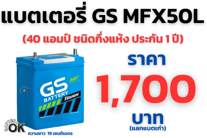 แบตเตอรี่ GS MFX50L ขนาด 40 แอมป์ ชนิดกึ่งแห้ง ราคา 1,700 บาท ขั้วบวกอยู่ฝั่งซ้าย รับประกัน 12 เดือน คุณภาพดี ทน ประหยัด ร้านแบตเตอรี่โอเค ติดตั้งฟรีถึงที่ ในเขตพื้นที่บริการ