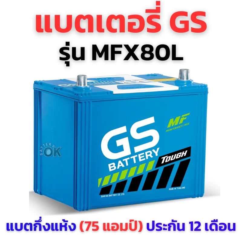 แบตเตอรี่ GS MFX80L ขนาด 75 แอมป์ ราคา 2,300 บาท ชนิดกึ่งแห้ง ขั้วบวกอยู่ฝั่งซ้าย รับประกัน 12 เดือน คุณภาพดี ทน ประหยัด ร้านแบตเตอรี่โอเค ติดตั้งฟรีถึงที่ ในเขตพื้นที่บริการ