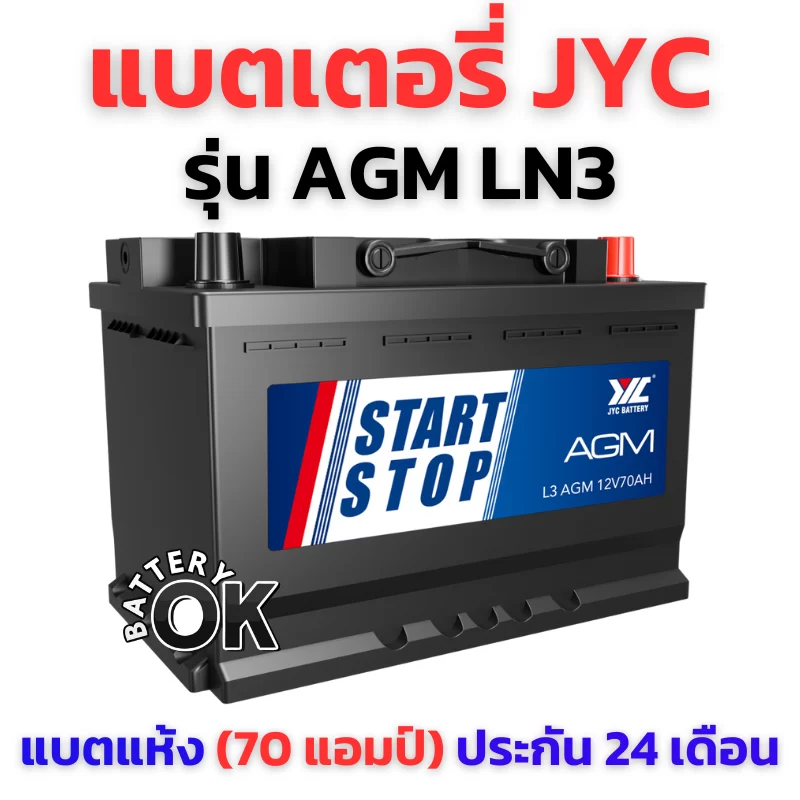 แบตเตอรี่ JYC AGM LN3 ขนาด 70 แอมป์ ราคา 5,500 บาท ชนิดแห้งรองรับ START STOP ขั้วจม ขั้วบวกอยู่ฝั่งซ้าย รับประกัน 24 เดือน คุณภาพดี ทน ประหยัด ร้านแบตเตอรี่โอเค ติดตั้งฟรีถึงที่ ในเขตพื้นที่บริการ