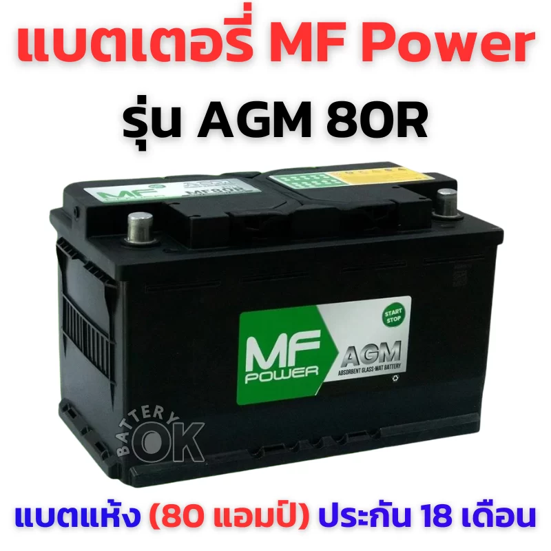 แบตเตอรี่ MF POWER AGM80R ขนาด 80 แอมป์ ราคา 7,300 บาท ชนิดแห้งรองรับ START STOP ขั้วจม ขั้วบวกอยู่ฝั่งขวา รับประกัน 18 เดือน คุณภาพดี ทน ประหยัด ร้านแบตเตอรี่โอเค ติดตั้งฟรีถึงที่ ในเขตพื้นที่บริการ
