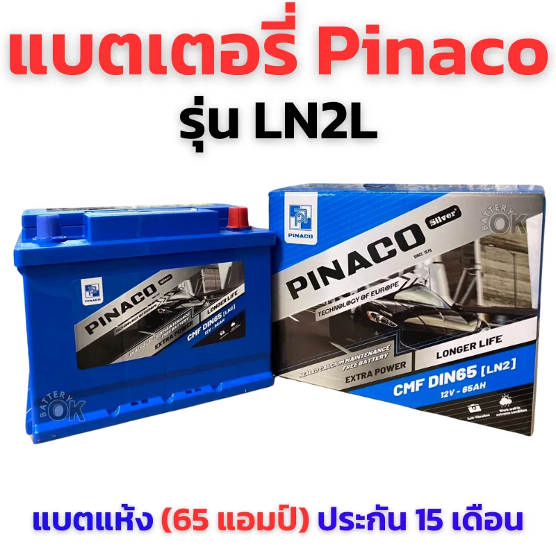 แบตเตอรี่ Pinaco DIN65L ขนาด 65 แอมป์ ราคา 2,400 บาท ชนิดแห้ง ขั้วจม ขั้วบวกอยู่ฝั่งซ้าย รับประกัน 15 เดือน คุณภาพดี ทน ประหยัด ร้านแบตเตอรี่โอเค ติดตั้งฟรีถึงที่ ในเขตพื้นที่บริการ