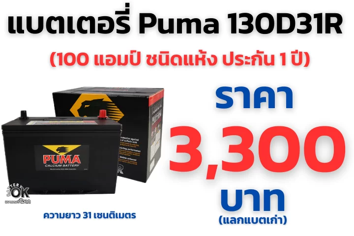 แบตเตอรี่ Puma 130D31R ขนาด 100 แอมป์ ราคา 3,300 บาท ชนิดแห้ง ขั้วบวกอยู่ฝั่งขวา รับประกัน 12 เดือน คุณภาพดี ทน ประหยัด ร้านแบตเตอรี่โอเค ติดตั้งฟรีถึงที่ ในเขตพื้นที่บริการ